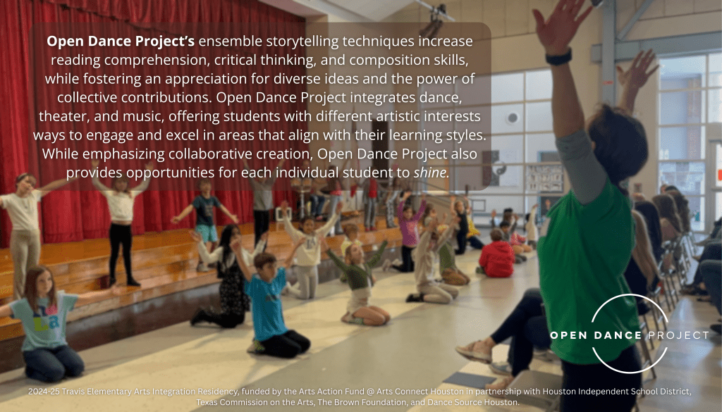 - Use Dance, Theater, and Music. By teaching the common vocabulary of the performing disciplines of dance, theater, and music, Open Dance Project offers multiple opportunities for students with diverse artistic interests to enter the creative process. Open Dance Project instructors believe firmly in the concept of multiple intelligences. Some students are kinesthetic learners and will connect to the choreographic exercises; some learn rhythmically or melodically and will excel at the composition of music for the performance; some connect with language and will compose highly creative and stage-worthy monologues or dialogues. By making all three performing disciplines accessible as tools for storytelling and performance, Open Dance Project makes room for students of many learning styles.
